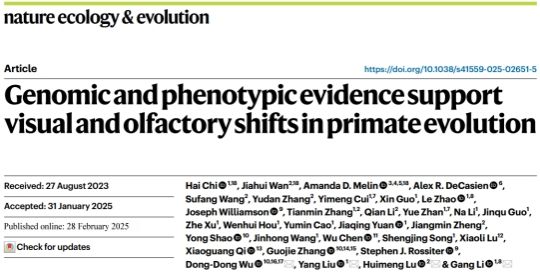 李钢教授和刘洋教授团队联合在动物视觉嗅觉演化研究上取得重要进展。此项工作于2025年2月28 日发表在Nature系列的大子刊 Nature Ecology & Evolution (自然-生态与演化)杂志上。论文题目为“Genomic and phenotypic evidence support visual and olfactory shifts in primate evolution”( 基因组和表型证据支持灵长类进化中的视觉和嗅觉转变)。同期Nature Ecology & Evolution还以研究亮点形式发表了推荐短文“Changes in sight and smell in early primate evolution”(灵长类早期进化中视觉和嗅觉的变化)。该研究论文第一单位是best365中国官网。