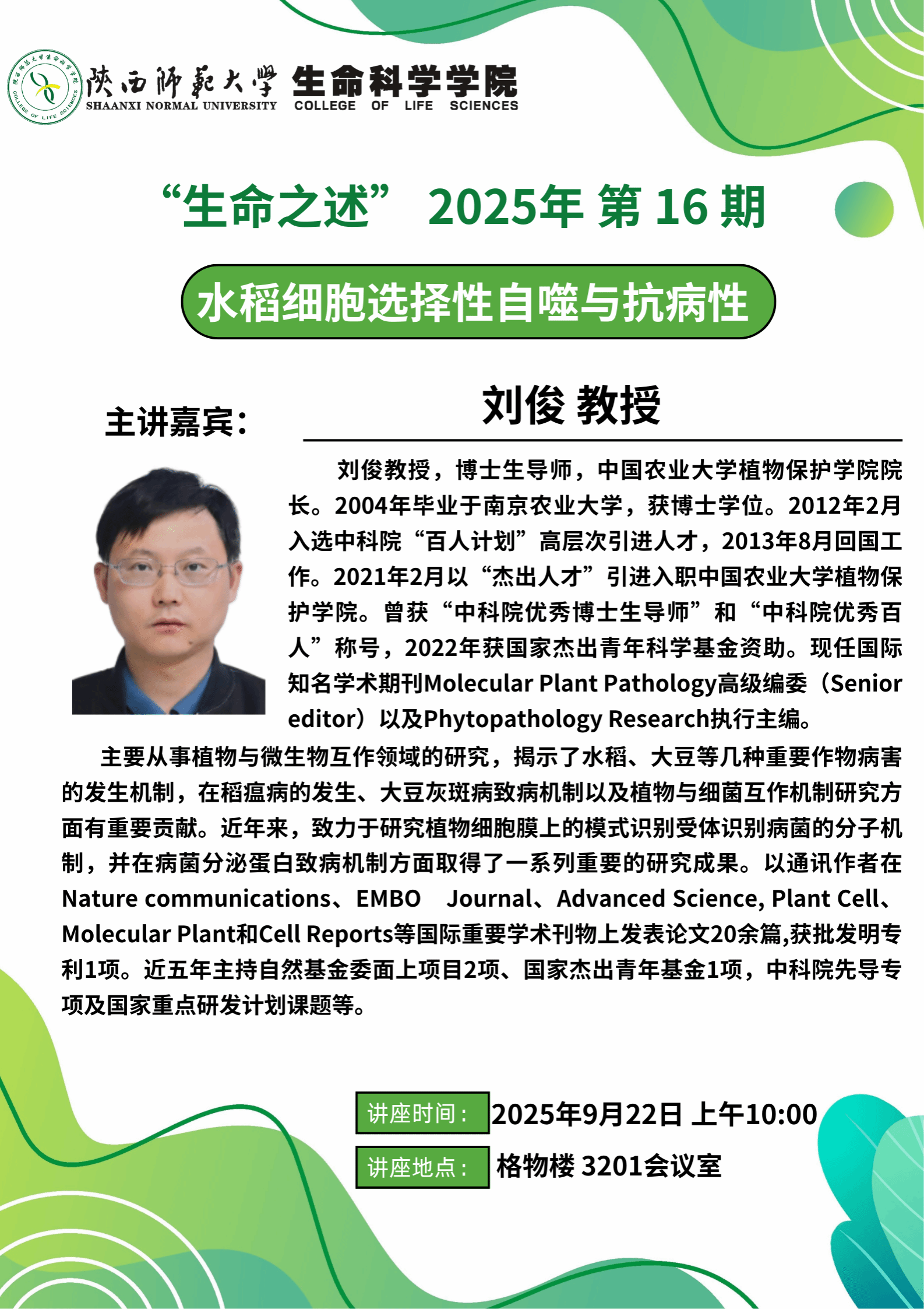 “生命之述”系列讲座 2025年 第16期 - 水稻细胞选择性自噬与抗病性