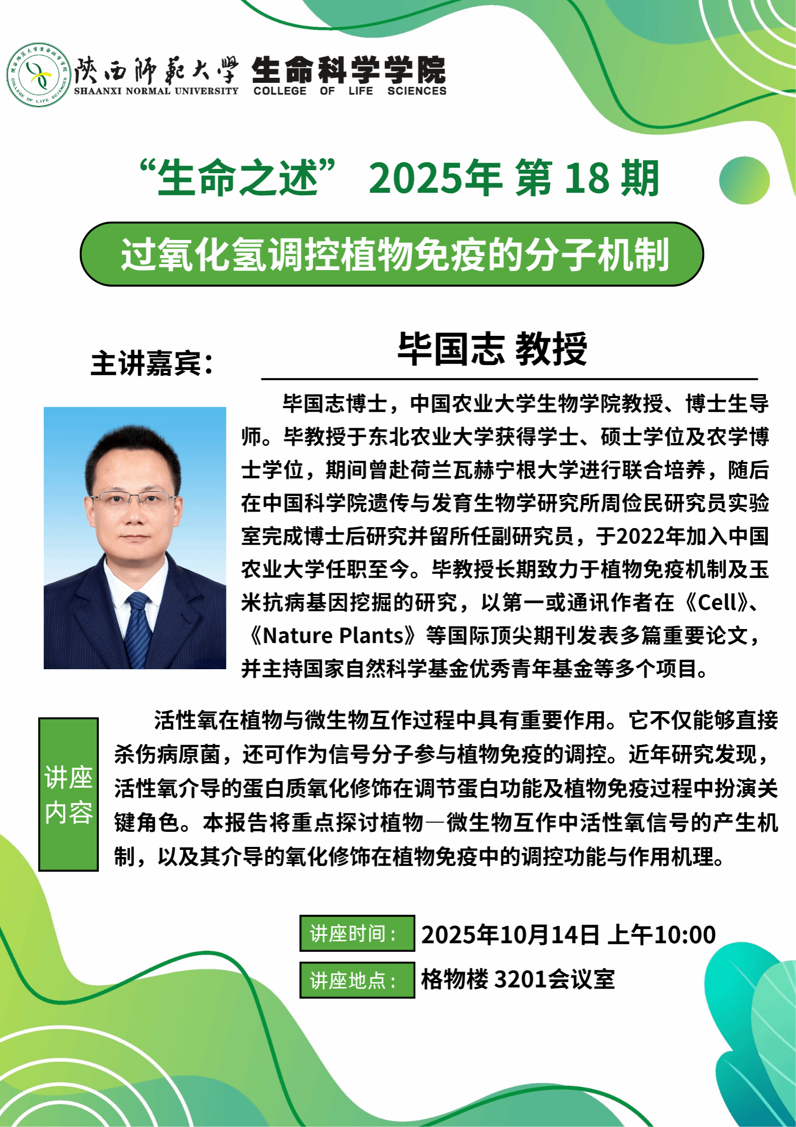 “生命之述”系列讲座 2025年 第18期 - “过氧化氢调控植物免疫的分子机制”