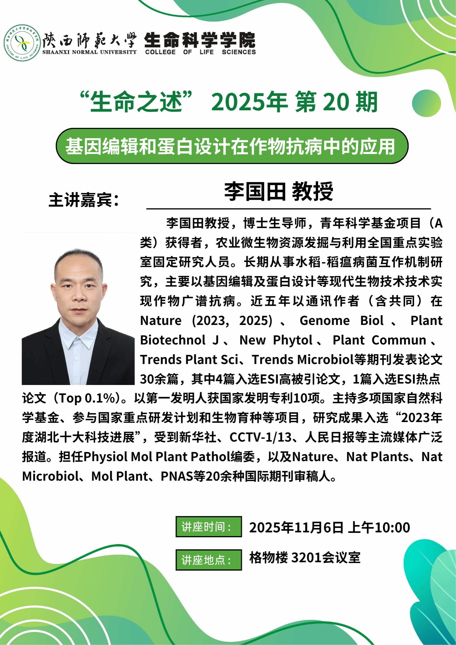 “生命之述”系列讲座 2025年 第20期 -“基因编辑和蛋白设计在作物抗病中的应用”