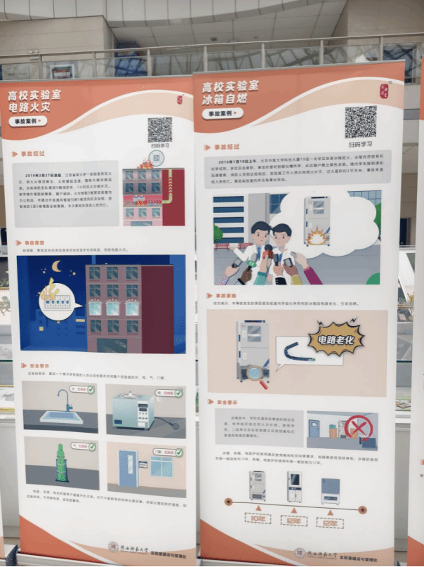 本区域通过专题展板还原真实安全事故,深入剖析实验室常见风险隐患与违规操作可能引发的严重后果,极具警示教育意义。每块案例展板均附有专属二维码,师生扫码即可观看配套安全学习视频,拓展学习内容,进一步巩固安全知识,提升防范能力。